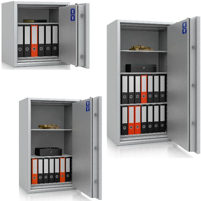 Schränke mit 60, S 60 P und S 60 DIS Güte-/Brandschutzklasse, Zertifizierung nach EN 1047-1 oder NT Fire 017, Einbruchdiebstahlschutz mit S2 Zertifizerung oder Widerstandsgrad 1 Zertifizierung. Viele Modelle in RAL 7035 lichtgrau oder in RAL 7024 graphitgrau. Diverse Schlossvarianten und viel Zubehör auswählbar.