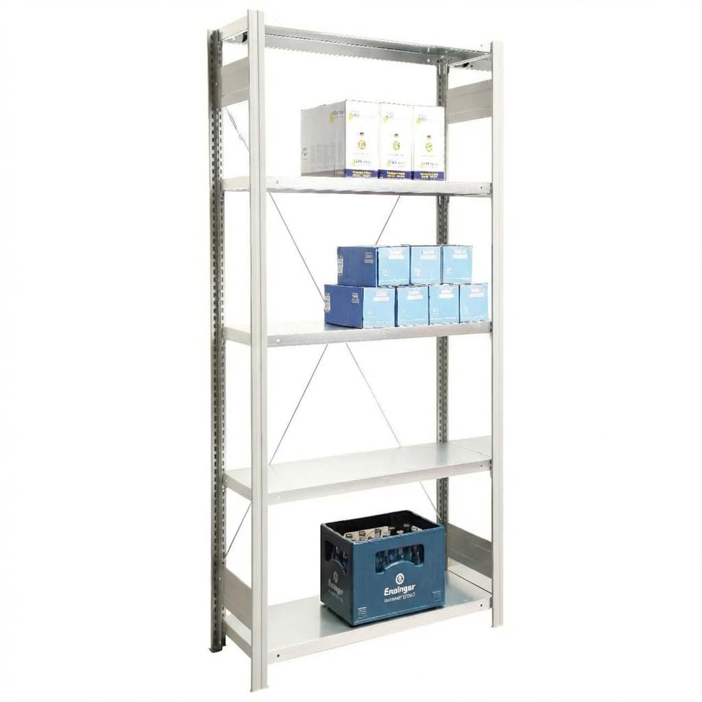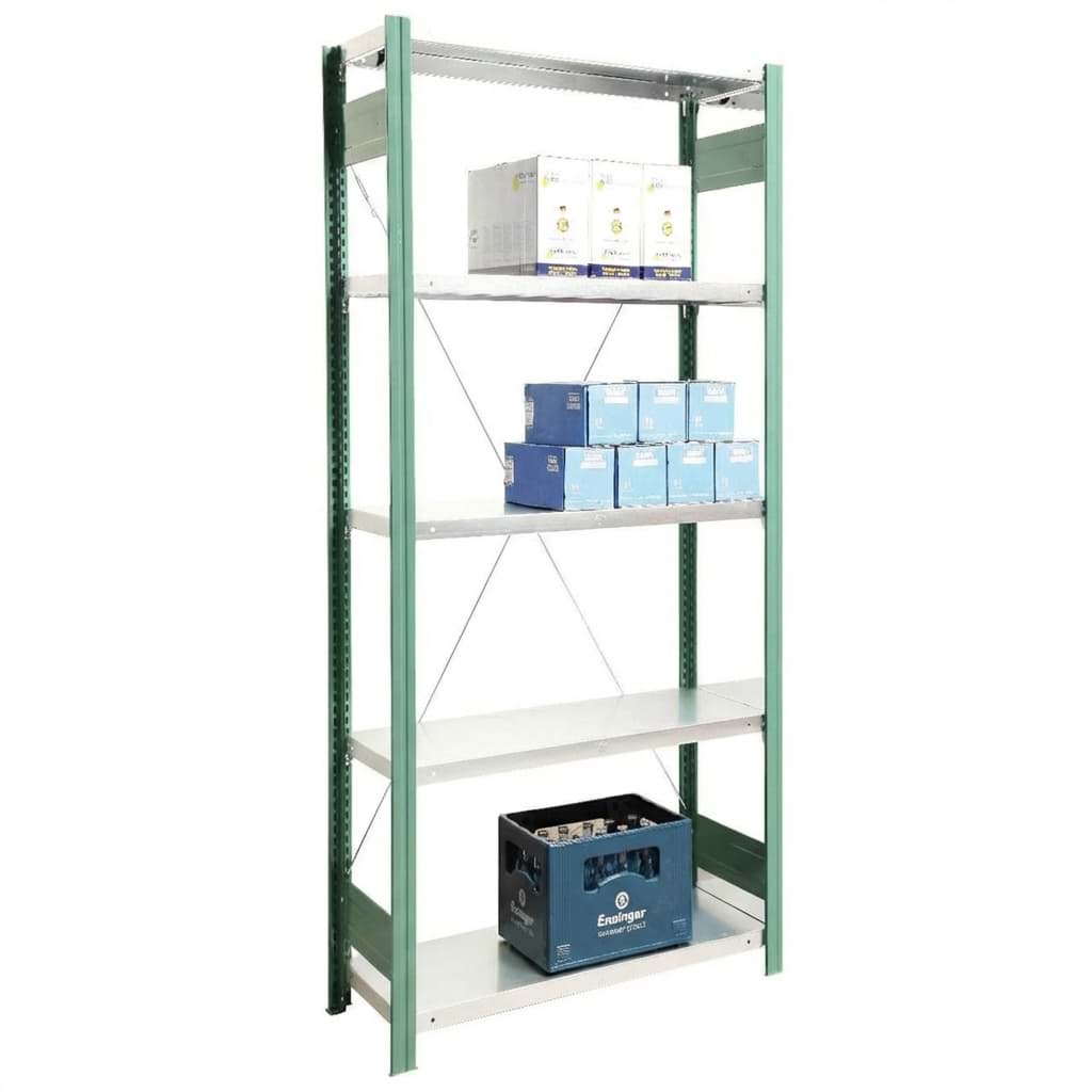 5 Stahlfachböden 2 Rahmen in Farbe lackiert mit Tiefenriegel verzinkt, Versteifungskreuz verzinkt, Stahlfachböden verzinkt, Fachlast 150 kg. Feldlast 2000 kg., Achtung: die Aufstelllänge der Regale kann je nach Situation grösser als die angegebenen Masse sein.